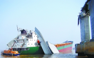 江苏昆山大洋桥——2007年8月29日中午,江苏省昆山市大洋桥水域内,一艘水泥货船因避让其他船只,撞上了大洋桥桥墩,致大洋桥半桥面发生坍塌,当时造成船上一男子腿部被砸伤,另有两人落水死亡。