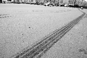 两车相撞的位置处于十字路口正中央。地面上撒满了玻璃碎片,还有一些车皮等零件。路面上留下一条漆黑色的刹车印,记者目测了一下,足足有100多米远。