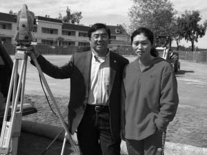 图为王晓红与她的丈夫何鸿波在已开工的佛利蒙室内游泳馆工地前合影。 (美国《侨报》/陆杰夫 摄)