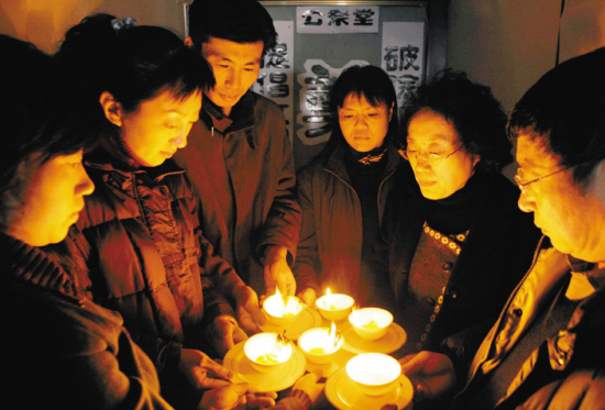 社区设置的公祭堂前,六盏“长明灯”正在燃烧着,前来祭奠的人说,这是他们寄托思念的心灯,因为“长明灯的灯芯正是自己一点一点揉搓出来的。”社区居民小静的父母都亲手做过灯芯儿。为了让灯尽可能长时间燃烧,灯芯不能太紧,太紧不吃油;也不能太松,太松灯油一浸就散了;而且,棉条必须很细,否则火苗就会太旺,不安全。小静说,看见母亲的每一下揉搓,都仿佛在向已逝的亲人们叮嘱着、诉说着……