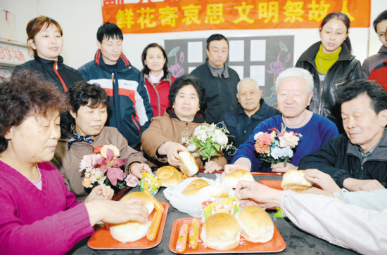 社区居民高守安大爷正在给居民们讲有关寒食的典故:“春秋时候,晋国公子重耳逃亡在外,当时,有个忠臣介子推历经磨难陪伴其左右,最终辅佐重耳复国……”居民们一边笑眯眯地听高守安大爷讲着,一边忙着手里的活儿:把面包、香肠、小菜装到盘子里,摆到桌子上,因为他们正要过一次真正的寒食节。“这些东西都不是烧煮的。咱们还准备了鲜花,一会大家就一起坐着吃东西,赏花,唠唠嗑。我们的过法很传统,又很有新意吧?”社区任书记告诉记者,日常祭奠时难免有人会难过,用这种方式来表达对已故亲人的尊敬和悼念之情,既增加了清明节的内容,大家在一起吃着说着,互相安慰着,也能让人的心情好起来。