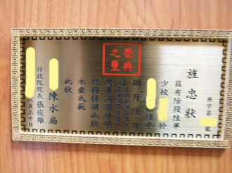 亡故台军的“旌忠状”有“陈水扁”三字,令很多遗族无法向先人交代。(图片来源:联合报)
