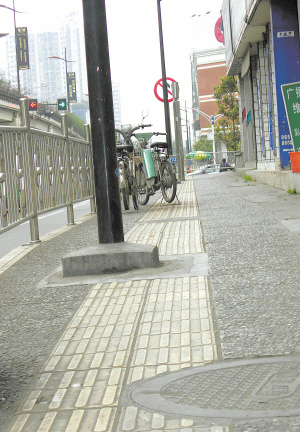 记者在武成大街和庆云南街交叉口看到,一个路口的信号指示灯正好竖立在盲道上。武成大街和望平滨河路交汇处,一个安装电子眼的杆子也竖立在盲道正中央。玉林南街,一排排自行车、机动车将盲道压得“严严实实”。燕鲁公所街上,右侧道路被汽车“霸占”,盲道就在车轮下。而左侧道路上的盲道更加“拥挤”,上面摆放着小餐馆的桌椅板凳、送货的三轮车、顾客的自行车,就连正常人都“寸步难行”。玉洁巷口,一段10米不到的盲道上出现了两个90度的拐角,上面还有窨井盖。一旦窨井盖被损坏或被盗,盲人由此经过后果不堪设想。