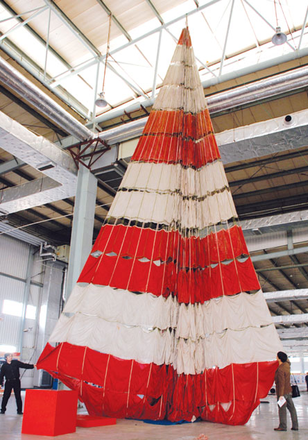 飞船返回舱返回地面时,会释放出一个主降落伞,小记在展厅里就看到了这类降落伞的实物,它打开后的面积足可覆盖一个学校操场!
