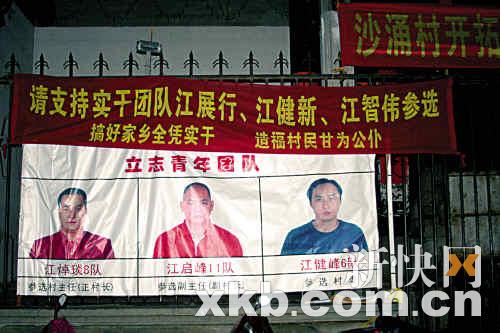 “实干青年团队”:以在本村工作的年轻人为主,他们有的当过村的国土员、治安队长,对村里的情况比较熟悉。他们是:村主任参选人江展行,副主任参选人江健新,村委参选人江智伟。