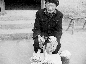 韩老有一件“传家宝”,那就是陪伴他度过50年的“百年剖篾刀”。说起这把“百年剖篾刀”,韩根生老人就会满脸笑容地介绍道:这把刀是他在30岁的时候舅舅送给他用来做洗篾帚用的,这把刀在他的舅舅手上做洗篾帚已经用了50多年了,现在他自己手上也度过了50个“春秋”。