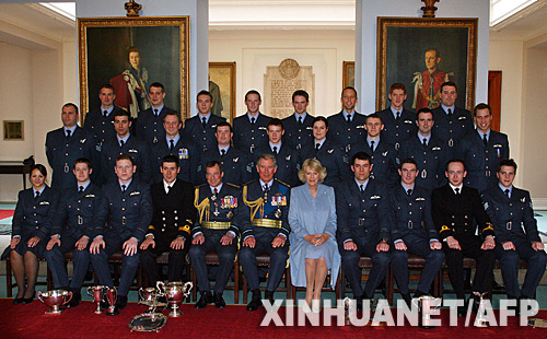 4月11日,在英格兰林肯郡的英国皇家空军克兰韦尔空军基地,英国威廉王子(二排右一)和其他空军毕业生与查尔斯王储(前排中)、康沃尔公爵夫人卡米拉(前排右五)等人在毕业典礼后合影。