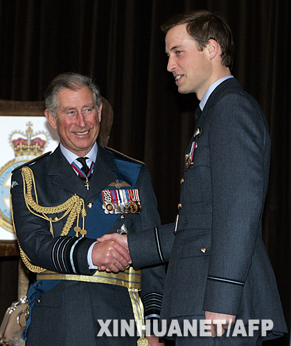 4月11日,在英格兰林肯郡的英国皇家空军克兰韦尔空军基地,英国威廉王子(右)在他的毕业典礼上接受父亲查尔斯王储颁发的飞行徽章。当日,威廉王子完成了紧张的飞行训练课程,毕业成为一名英国皇家空军的飞行员。