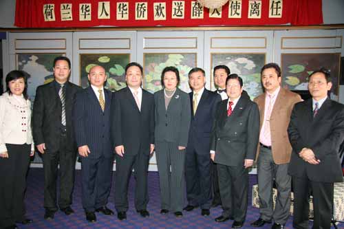 面对旅荷华人华侨的热情感言,薛捍勤大使应会议主持人王盟中的邀请,为旅荷华人华侨发表了讲话,她说,她很感动,旅荷华侨为她举办的欢送酒会,来荷兰4年零7个月的外交生活,使她亲眼目睹了旅荷华侨强烈的爱国热情,在欧洲第一面五星红旗升起的地方荷兰,她看到了许许多多,使她非常感动的是荷兰侨胞生活俭朴,把省下来每一块铜板都用来支持祖国建设,无论祖国遇到什么自然灾害,荷兰侨胞都以其饱满的爱国热情,出钱出力,令她感动,她代表祖国政府深情向广大旅荷侨胞说了声谢谢!祖国人民不会忘记你们,你们在中荷两国未建交之前就同祖国同呼吸、共命运,为中荷友好发挥了重要作用,我们今天看到了一代又一代旅荷华侨发展出色,从每一年的中国年彩装游行我看了中国文化在荷兰影响不断深入,看到越来越兴旺的荷兰华人社会,我代表我自己和我先生向你们表示由衷的感谢。