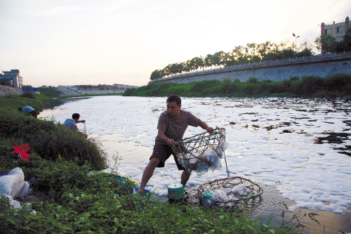 江先生经常在这白色泡沫与黑污的古怪组合里洗塑料布。来源:东莞日报
