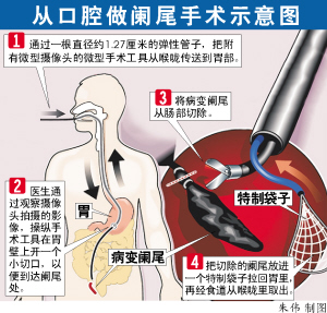 传统阑尾切除手术中,医生需在患者腹部动刀,把病变阑尾摘除。而现在,不需在患者腹部动刀同样可以成功摘除阑尾。美国医生近期成功为患者杰夫·斯科尔策进行无疤痕手术,利用管道和微型摄像头操纵手术器械,把病变阑尾经过患者口腔切除并取出。