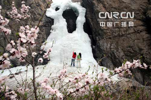 中广网北京4月19日消息(记者黎政祥 实习记者车丽 通讯员贾德勇)4月19日,记者在北京市延庆县有关部门了解到:北京市延庆县永宁镇青龙潭,满山遍野的杏花争奇斗艳,山谷幽静而清香。穿过万亩杏花林,数十米高的悬崖上一块巨冰矗立着,崖底依然是冰天雪地,冰面总共有一百平米,冰水在山谷间流淌,冰的不远处就是盛开的杏花。冰与杏花,不同季节的产物在这里构成一道美丽风景。