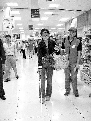 根据规则,在一超市里,小杨阳们要在15分钟内买3个苹果、1捆芹菜和一瓶酸奶。在此过程中,不能摘下眼罩,身边的义工只能提醒体验者不要碰到障碍物,其他包括问路、选购、买单全部得由体验者独立完成。蒙上眼罩、拿起盲杖后,小杨阳一边点着盲杖,一边问旁人,苹果在哪里?芹菜在哪里?酸奶在哪里?到哪可以过秤?到哪可以买单?被告知直走就可到达目的地时,小杨阳用起了自己短道速滑的姿势向前慢慢地直线“滑行”。完成最后一个任务后,在收银台,小杨阳遭遇了难题,21.8元,对于不同面值的纸币,她根本分辨不出来,只好把一个信封的钱都递给了收款员,让收款员自行拿钱、找钱。