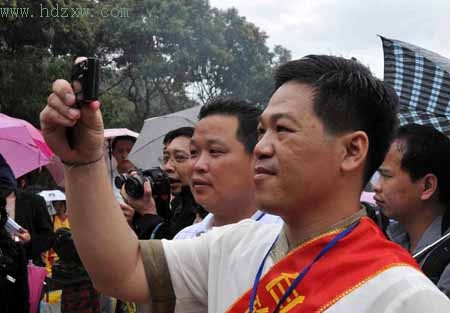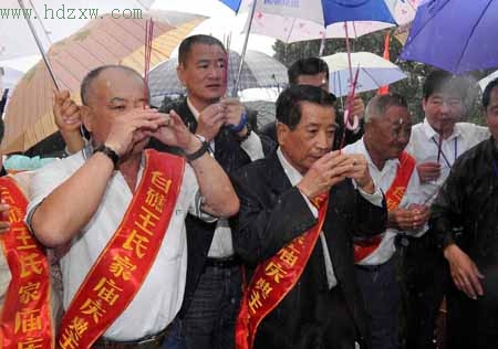 昨天,倾盆大雨整整下了三个小时,但是风雨难阻台湾王氏宗亲祭祖的脚步。昨天上午8时许,龙海白礁的王氏宗亲就组织了鼓乐队等候在村口,白礁村的长老们依古礼穿上蓝布长衫,身披绶带,头戴礼帽,在村口敲锣打鼓迎接台湾来的亲人。