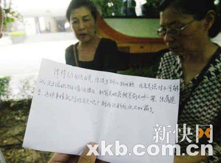 谭静的母亲(左)给媒体写了一份声明书。许都/摄
