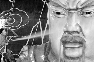 洗脸(图) 天津日报 《天津日报》官方账号 2008.04.2207:07 关注 4月21日,工人为许昌市春秋楼景区关圣殿内的关羽坐像“洗脸”。当日,河南省许昌市有关部门对位于春秋楼景区关圣殿内高达13米的关羽坐像进行全面清洗,关羽像表面的灰尘一扫而光。春秋楼,又名大节亭,传说是三国名将关羽在许昌秉烛夜读《春秋》的地方。 新华社发 (牛书培 摄)