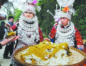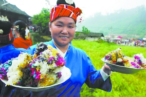 4月20日是贵州省台江县苗族传统节日姊妹节的第一天,当地苗族同胞用五彩的“姊妹饭”招待宾客。“姊妹饭”由糯米和不同颜色的植物蒸煮而成,不同的色彩象征不同的意义,如黄色象征家中富有、五谷丰登,绿色象征家乡美丽。图为台江县老屯乡老屯村的苗族姑娘在寨门前用“姊妹饭”迎接客人。新华社发