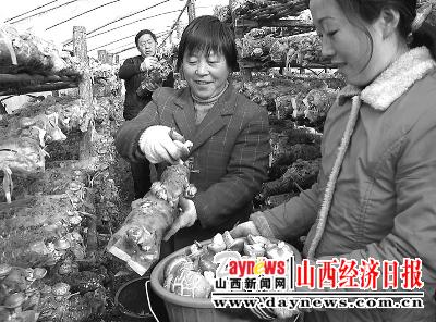 垣曲县蒲掌乡依托沐风公司先后建起百余个大棚,形成食用菌开发基地,靠食用菌技术培育蘑菇增加收入,首批10个大棚已出菇2000公斤,销往河南、广东等地,收入10万多元。图为县蒲掌乡堤沟村农民在大棚内采收香菇。