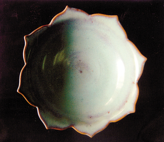 此碗莲瓣口,弧形腹,圈足。整个造型好似一朵盛开的莲花,优美生动。通体施月白釉,釉面滋润肥腴,呈乳浊状。这种乳浊状是钧窑工匠通过特殊配方创烧而成的。后人赞曰:“钧与玉比钧比玉美,似玉非玉胜似玉。”此器胎质略为粗松,釉面有棕眼,圈足内外无釉,露胎处呈浅褐色。为典型的元代钧器特征。