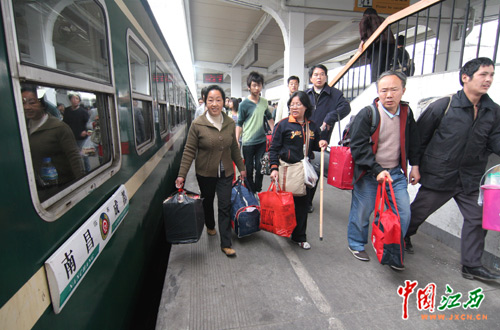 “‘绿皮车’的票价、‘红皮车’的速度、‘蓝皮车’的服务”,在列车留言簿上,一位乘客对1987/8次列车作出了这样的评价。图为4月23日中午,在南昌火车站旅客进站乘车。(中国江西新闻网记者 邓小勇 摄)