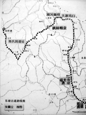 张宝昌根据苏东坡存世的一些作品,还原了这条长35公里的葛溪古道路线:从新城出发向北,塔山→潭山头→湘主→湘溪→三溪口→洞桥→万市→南新→临安→杭州(这是苏东坡回杭州的路线)。张宝昌说,当年苏东坡至少来过新城二三次,行走路线大致是:东路——走驿道经富阳入境,西路——经临安折入葛溪古道。