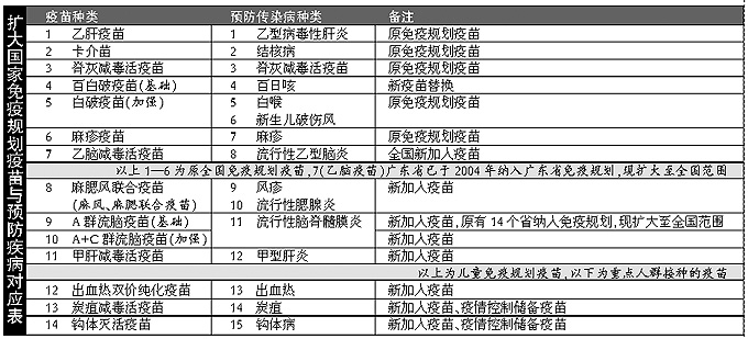 据介绍,从2008年起,广东省将扩大儿童免疫规划范围,在现行使用的乙肝疫苗、卡介苗、脊灰疫苗、百白破疫苗、白破疫苗、麻疹疫苗、乙脑疫苗等7种疫苗的基础上,将甲肝疫苗、流脑疫苗、麻腮风联合疫苗纳入国家免疫规划,对适龄儿童进行免疫接种;并根据传染病流行趋势,在流行地区对重点人群进行流行性出血热疫苗接种、炭疽疫苗、钩端螺旋体疫苗接种。