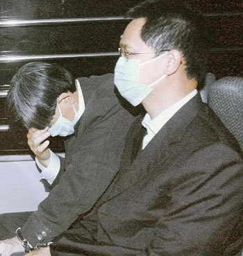 与父亲谢瑞麟关系“微妙”的谢达峰(后),与同案被告王庭芳(近镜头者),24日被囚车押走。(图片来源:明报)