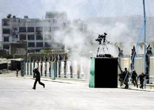 正当现场奏完阿富汗国歌、卡尔扎伊准备发表开幕演讲时,多枚火箭弹爆炸声及枪声突然在附近响起。电视镜头中,阿内阁成员、其他政党领导人以及多国驻阿外交官在讲台前闻声下蹲,仓皇寻找掩护。数百名现场围观者则四散逃开,争相奔向可作掩护的附近车辆。