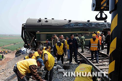 4月28日4时41分,北京开往青岛的T195次旅客列车运行至山东省境内胶济铁路周村至王村间脱线,与烟台至徐州的5034次客车相撞,伤亡人数和事故原因正在调查中。这是事故现场(4月28日摄)。 新华社记者范长国摄