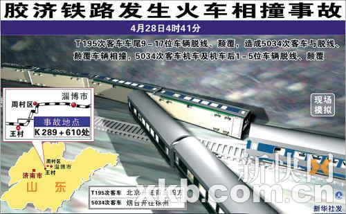昨日凌晨4时41分左右,由北京开往青岛的下行T195次旅客列车,运行至山东省境内胶济铁路周村站至王村站间,发生列车脱线事故,机车后第9至17位车辆脱轨,其中尾部车辆侵入上行线,被上行线由烟台开往徐州的5034次旅客列车碰撞,造成5034次列车机车及机车后第1至5位车辆脱轨。