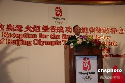 中新社曼谷四月二十九日电 (记者 顾时宏)二十九日晚,中国驻泰国大使馆在此间举行曼谷奥运火炬接力成功传递答谢招待会,泰国副总理沙南、曼谷市市长阿皮力、泰国奥委会主席育塔萨、中国驻泰大使张九桓以及来自泰华社团侨领等各界人士近千人出席了答谢晚宴。