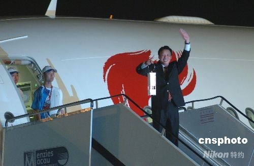 五月二日晚十时十分,北京奥组会执行副主席杨树安护送北京奥运圣火抵达澳门国际机场,中央人民政府驻澳门联络办公室主任白志健、澳门社会文化司崔世安司长等百余人到机场迎接。明日,奥运火炬将在澳门传递。中新社发 史利 摄