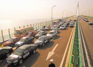 据介绍,1日15时许,杭州湾大桥通车仪式结束后,在杭州湾大桥慈溪入口处即陆续出现排队等候的车辆。至23时许,车队长达10公里。