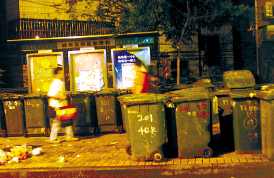 记者在郑先生所说的地方看到一字排开的数十个垃圾桶,可奇怪的是,每个垃圾桶里都空空如也,而路上也确实堆着一堆垃圾,散发出阵阵臭味。郑先生告诉记者,他家楼下的这个“垃圾场”只出现于每天晚上9时钟左右,“早上起来上班的时候就会消失了,可垃圾堆积的这段时间实在难挨”。