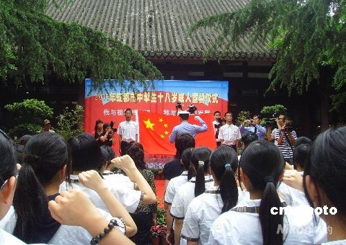 2008年5月4日是“五四”运动89周年纪念日。当天上午,130名成都中学生代表参加了在成都杜甫草堂举办的18岁成人宣誓仪式,同学们面向国旗庄严宣誓,许下自己的人生承诺。中新社发 霍潺 摄