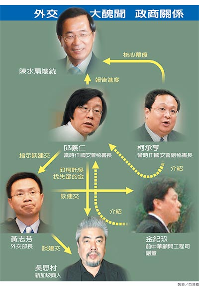 吴思材昨天不愿进一步说明所谓的“list”是否就是佣金明细或是要打点谁。“外交部长”黄志芳稍后则否认允诺给付建交佣金,指吴思材说的一百万美元是吴单方面的“期待”,“外交部”只承诺成功建交后会给予金、吴两人“适当的差旅费用补助”。