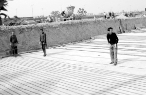 昨日9时,记者赶到中原西路中原大桥东侧,路北通向保吉寨村的小路西侧,两栋楼的厚厚水泥楼基,已经铺好。推土机把两侧的土翻出几道土岭,建筑工人在铺好的水泥地基上,铺设钢筋。施工的赵先生介绍,他们刚接到这两栋楼的工程,业主是保吉寨村的人。“这两栋楼盖好后,卖给该村村民一些,还向外卖一些。”赵说,因为工期紧,他们一直加紧施工。“昨天下午浇楼基,混凝土车和注浆车一直忙到很晚,才把楼基做好。楼基还没有凝固实在,就催着我们排钢筋。”
