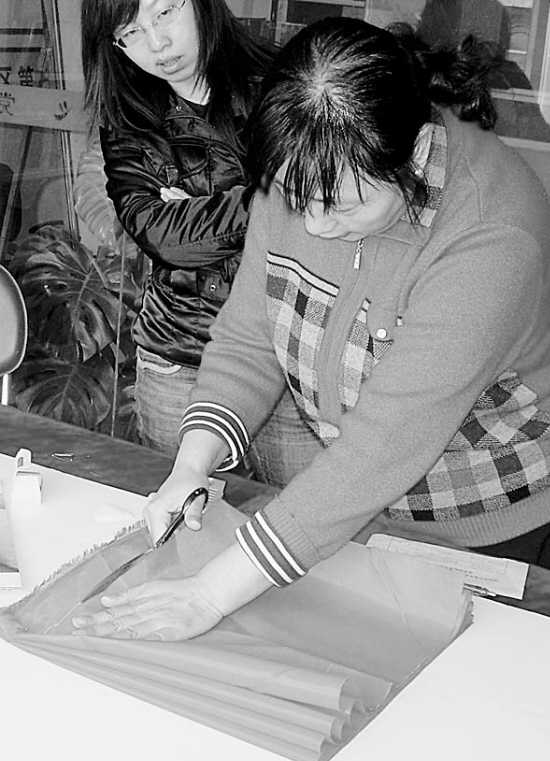 “得知超市的免费塑料袋将要取消的消息,我们就已经着手准备环保购物袋了!”社区书记白晓光告诉记者,驻区的华姿大厦提供赞助,为社区居民购买了制作环保袋的绸布料。“大红的,非常喜庆的颜色!”随后,社区里几位精通缝纫的巧手主妇们主动请缨,承担起制作环保购物袋的任务。