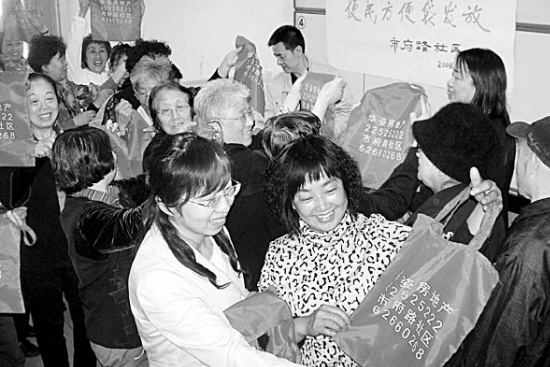 记者当天下午赶到市府路社区服务中心,从里面走出来的社区居民手中都拿着一个红绸袋子,不少已经装了东西拎了起来,大红的颜色格外醒目。“我家还没取呢,给我一个!”二楼的活动室,等待领取购物袋的队伍一直排到了楼梯口。