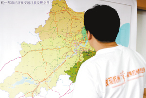 午后的京杭古运河畔,阳光明媚。杭州市交通局九楼会议室,两幅巨大的地图挂在墙壁上,不同颜色的虚实线纵横交错,或跨钱塘江,或走大运河,密密匝匝的射线、环线中间,是鲜红的“杭州”二字。这两幅杭州经济都市圈交通现状及规划图,占据了陈伟履任新职的大部分时间,图中粗细不等的虚实线标识,代表着不同的河道与高速,现已贯通或者在未来几年即将开通,这令杭州经济都市圈成员城市窃喜。