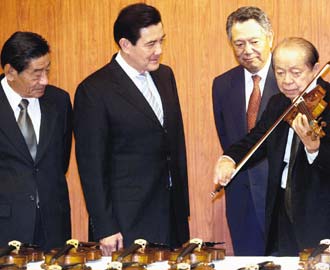 马英九(左二)昨天下午参观奇美博物馆,创办人许文龙(右一)、董事长廖锦祥(左一)、前奇美医院院长詹启贤(右二)陪同下,向马英九介绍展示收藏的世界名琴,许文龙现场拉起小提琴让马英九聆听。图片来源:联合报