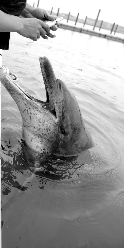 昨天下午两点半,刚好是给海豚喂食的时间。两名工作人员来到岸边,唤来海豚,然后把食物喂到海豚嘴里。才五分钟左右的功夫,一桶巴浪鱼就喂完了。据了解,每只海豚一天要吃10公斤的巴浪鱼,一天吃四餐,每餐2.5公斤,外带一些补充能量的“营养品”。