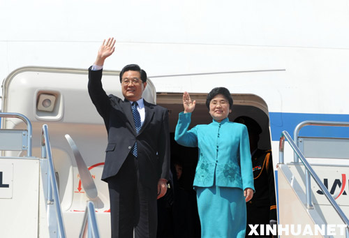 5月6日,国家主席胡锦涛乘专机抵达东京羽田机场,开始对日本进行国事访问。这是胡锦涛主席和夫人刘永清向前来欢迎的人们挥手致意。 新华社发
