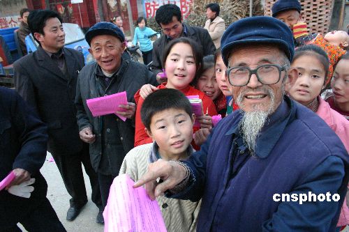 2007年11月6日下午,山东省阳谷县大布乡李堂村村民李兆明老人接过乡里工作人员发放的“村委会换届选举明白纸”,高兴地说:“怎样选村官,俺有哪些权,一看这张纸都明白了”。当日,山东省阳谷县大布乡的工作人员全部下到村庄,利用广播、宣传车、黑板报、放电影等形式宣传村委会换届选举工作,增加村委会换届工作的透明度,给群众“知情权”,让群众"早明白"。为即将在11月底举行的村委会换届做准备。中新社发 肖明磊 摄