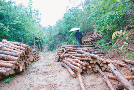 “快来这儿看看吧,几十年的林子都快被伐秃啦!”昨日上午,记者接到刘营村群众举报电话后,冒着滂沱大雨赶到刘营村。在大雨的冲刷下,村子南边的山林显得分外青翠,“这里看着还挺漂亮,但一进林场就变样啦,满坡的树木都被伐得乱七八糟!”带路村民向记者介绍,滥伐者对林场面对山外的一侧山坡“秋毫无犯”,只对山梁后面视线难及的林子疯狂砍伐。行进1公里后,滥伐的迹象开始显现:路边沟道里堆放着大垛大垛比较新鲜的松木,单株胸径多在20厘米以上;山坡林区内,伐倒的林木和残枝星罗棋布;每隔百余米,山坡上便会出现一条用于溜放木料的滑道,大量从山上滑下的原木堆积在便道边。