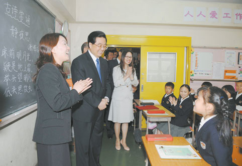 5月9日,国家主席胡锦涛参观横滨山手中华学校。这是胡锦涛同正在上课的小学生亲切交谈。 新华社记者李学仁摄