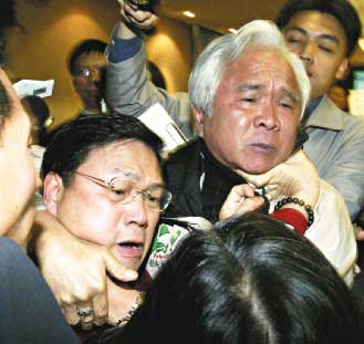 319事件让国民党错失重新执政机会,廖风德掌组织兵符,在“立法院”提案修法行政验票,和民进党“立委”林丰喜(右)冲突。(台湾《联合报》资料照片)