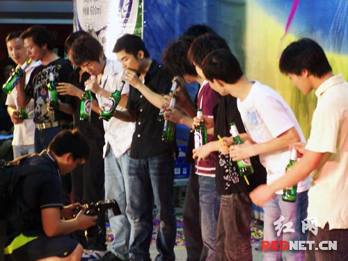 发布会中,主办方从现场随机邀请十位观众以吸管喝啤酒的形式来了个趣味比赛。当主持人一声令下,现场不少男士纷纷自告奋勇,其中10位年青男子获得比赛资格,并在发号令后开始疯狂猛吸。在众多观众的加油声中,一穿黑衬衣的青年男子以不到2分40秒的时间吸光一瓶啤酒获得最终胜利。一口气喝下一瓶啤酒,有趣的是参赛者们的赛后反应。当上冠军的喜悦不已,而更多的则是因吸得太慢的懊悔声。此外,一些不胜酒力者的感叹也相当抢眼。“可能喝得太急了,肚子有点难受”,一名19岁的男生在吸完半瓶啤酒后表示肚子有点不舒服,他笑称和自己随行的另一名参赛者因不胜酒力而有点呕吐。比赛者们各异的赛后反应也成了一个亮点。