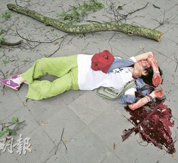 到都江堰一间佛寺做志愿者的港妇潘月荷,疑被倒塌的横梁打中头部,当场大量出血昏迷,拆腾12小时才被送入医院手术室,幸最终保住性命。(图片来源:明报)