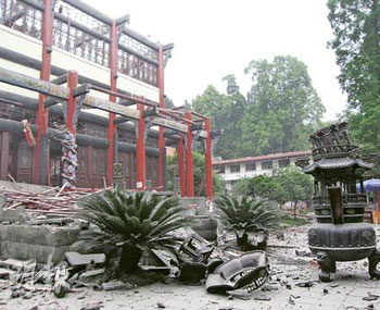 潘月荷遇事的地点都江堰青城山普照寺,在地震中损毁严重,石柱震碎,木制结构被震至倒塌。(图片来源:明报)